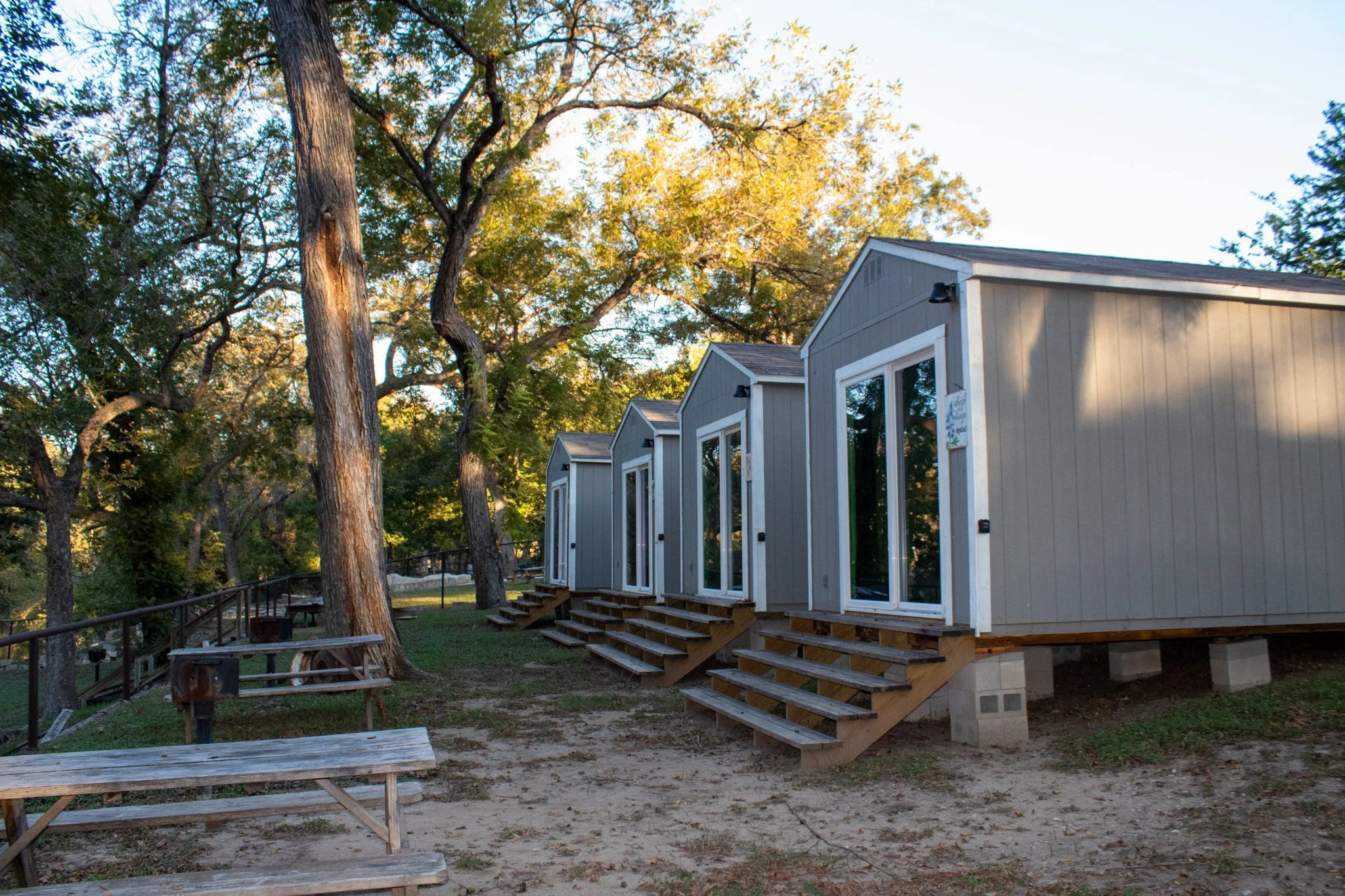 The newest addition to the campground (built in 2025), these four identical one-bedroom cottages each feature their own cheerful color theme. Overlooking the beautiful Guadalupe River, each cottage sleeps 4 with two fold-out couches, A/C, and all the comforts of glamping — no setup required.